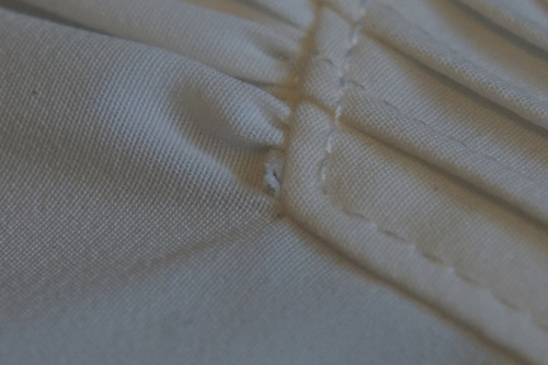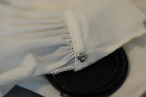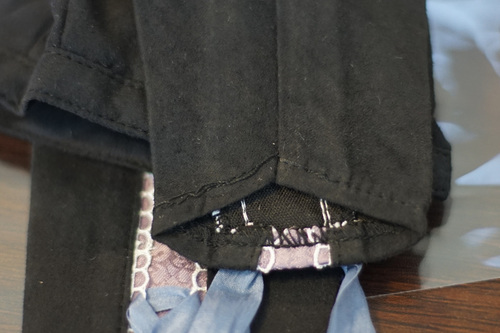 I discovered a hole in the sleeve of the blouse and then thouroughly inspected all clothing pieces. I found a bird's nest of thread in the outer showing leg of the pants. I contacted Volks with pictures and was asked to remove the excess thread on the pants and was sent a replacement blouse. The replacement blouse had a hole in another place. Volks did not consider it a defect when contacted again. The representative did not understand the issue and told me to cut off the fraying yarn as if it was extra fabric and not too little fabric.